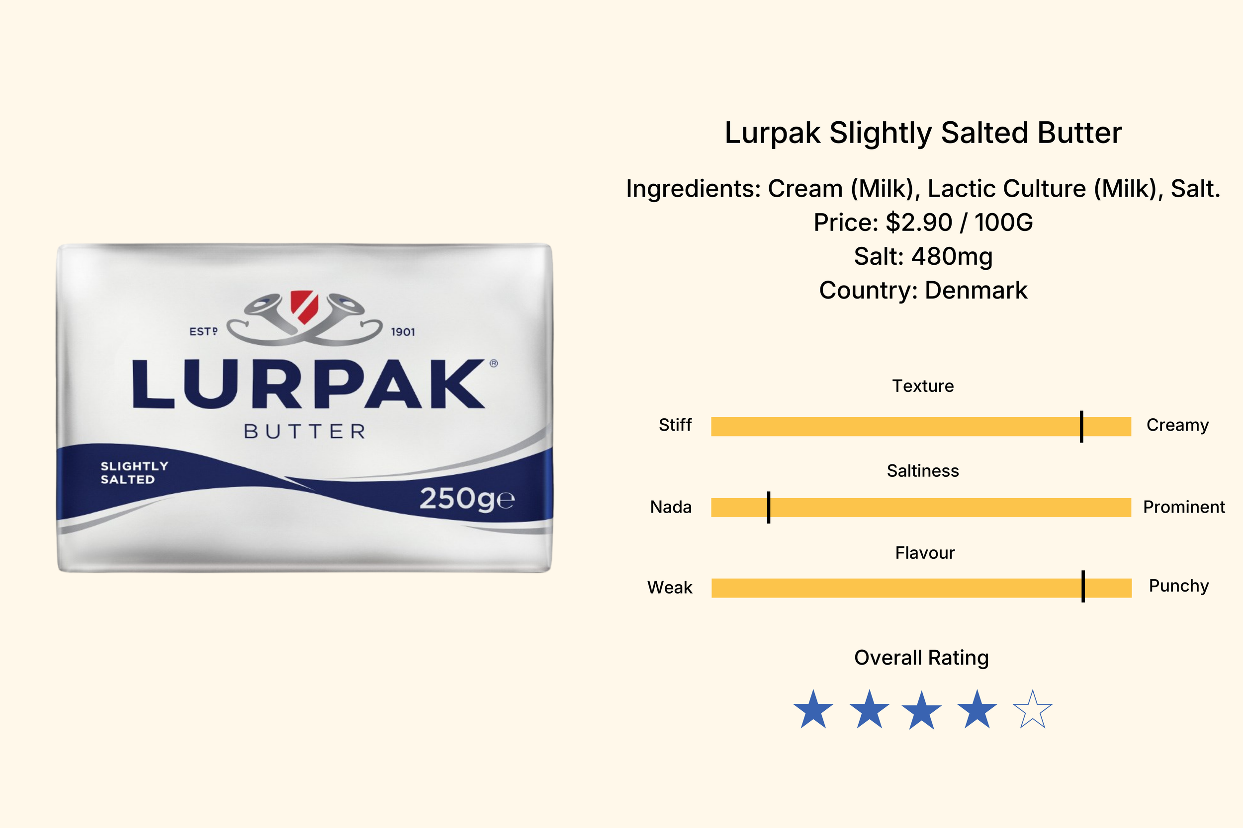 At first glance, we thought this was Lurpak from the silver foil packaging which I thought may have falsely improved its perception in the taste test. But it still proved enjoyable in the blind taste test too.