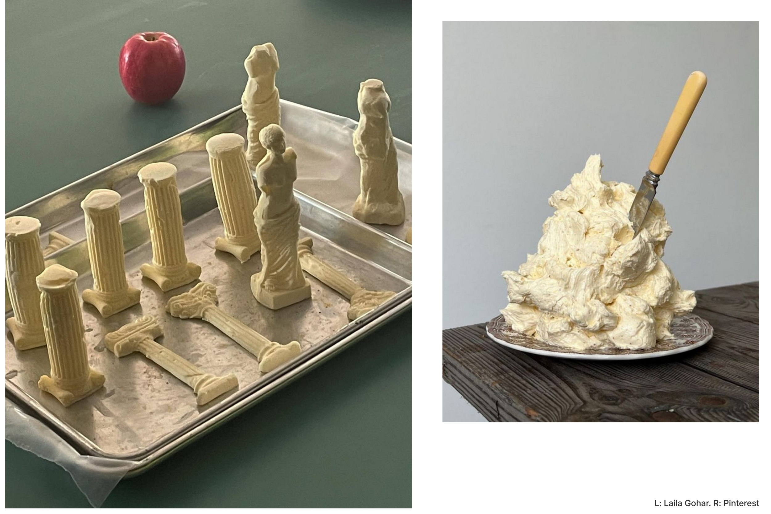 A little more tasteful, (in my eyes) is Laila Gohar, who’s been working with food as art for years. In her world, butter is always part of the scene. It sits on the table, people talk about it, and then it gets eaten. She even makes butter sculptures that are very intentionally made to be destroyed. I love that.