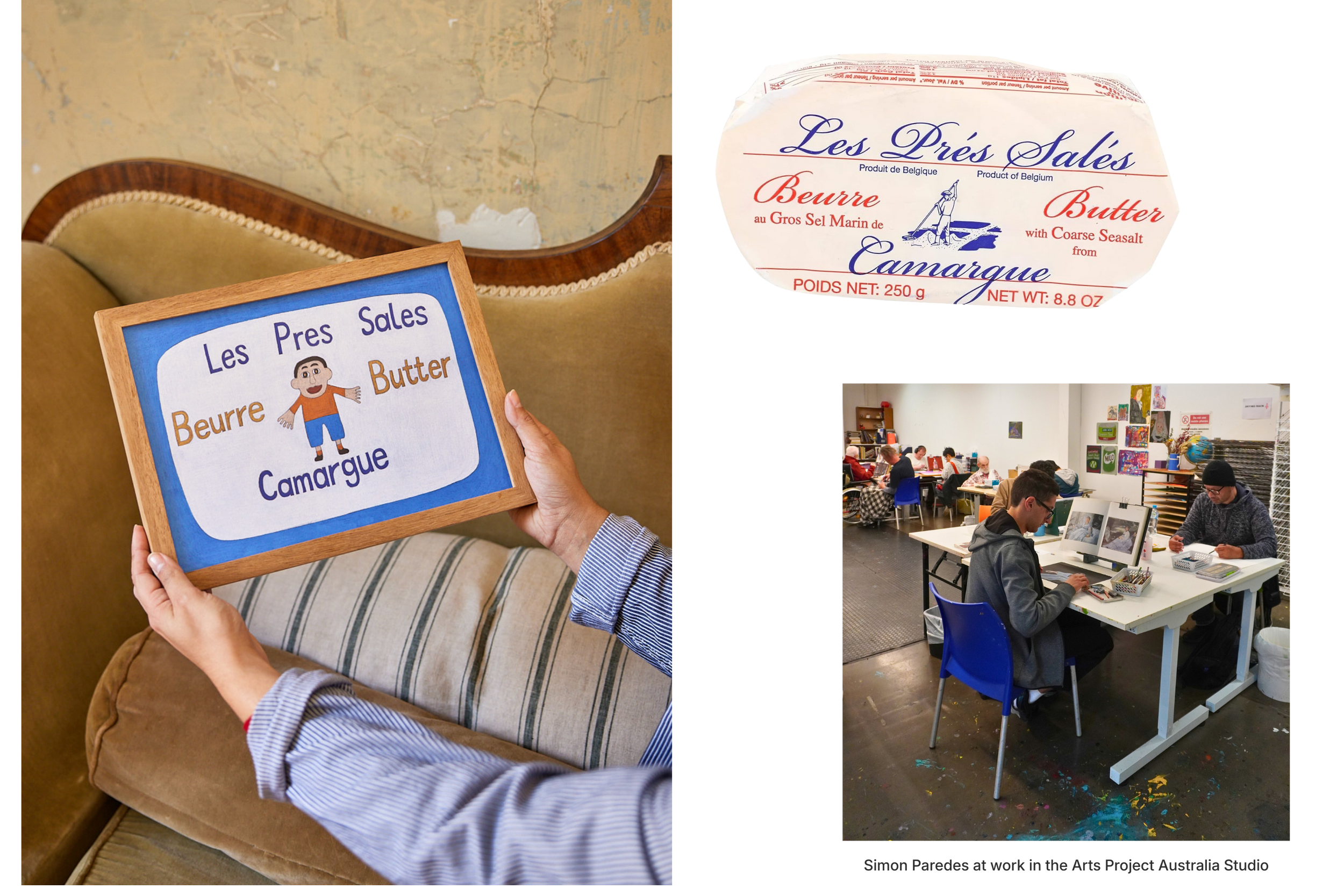 One of my favourite butter-related pieces we’ve commissioned is a portrait of butter, Les Pres Salés, by Simon Paredes from Arts Project Australia. Simon has a distinct, graphic style focussing on domestic iconic but injecting them with more verve and personality that the subject started with. Watching a fancy butter become a character through his eyes was pretty special.