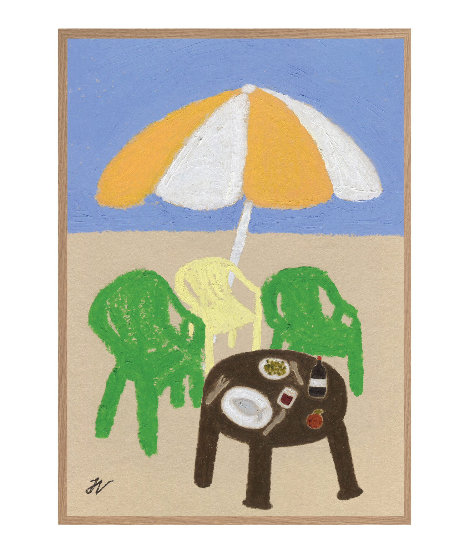 Through her signature oil pastel technique, Isabelle brings to life a sun-drenched moment that radiates nostalgia. This piece captures the effortless beauty of coastal life—where all you need is a few chairs, a delicious meal, and the warm embrace of the sun.