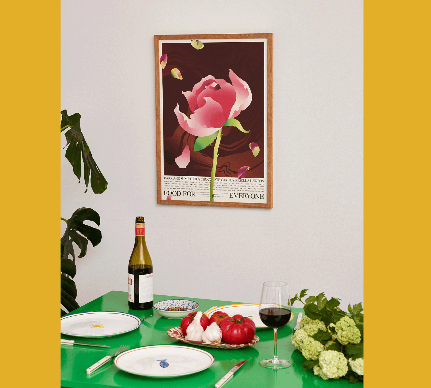 Adorned with rose petals and pistachios, this isn’t your average chocolate cake. Evi-O has run wild with the rose motif — it bursts onto centre stage, coming off the edges of the poster with pistachios tumbling down onto the swirly, devilish chocolate cake below.