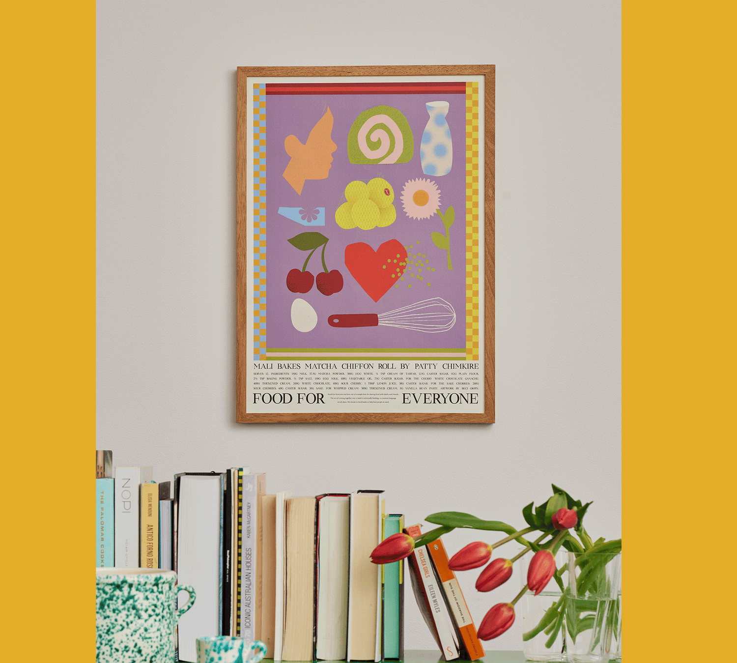Artist Beci Orpin’s work celebrates women who create, in her signature application of colour, shape and optimism that has made her an Australian icon and industry legend. Here Beci has depicted the beautiful ingredients of the Matcha Chiffon Roll while also capturing the most essential element of the recipe, Patti herself.