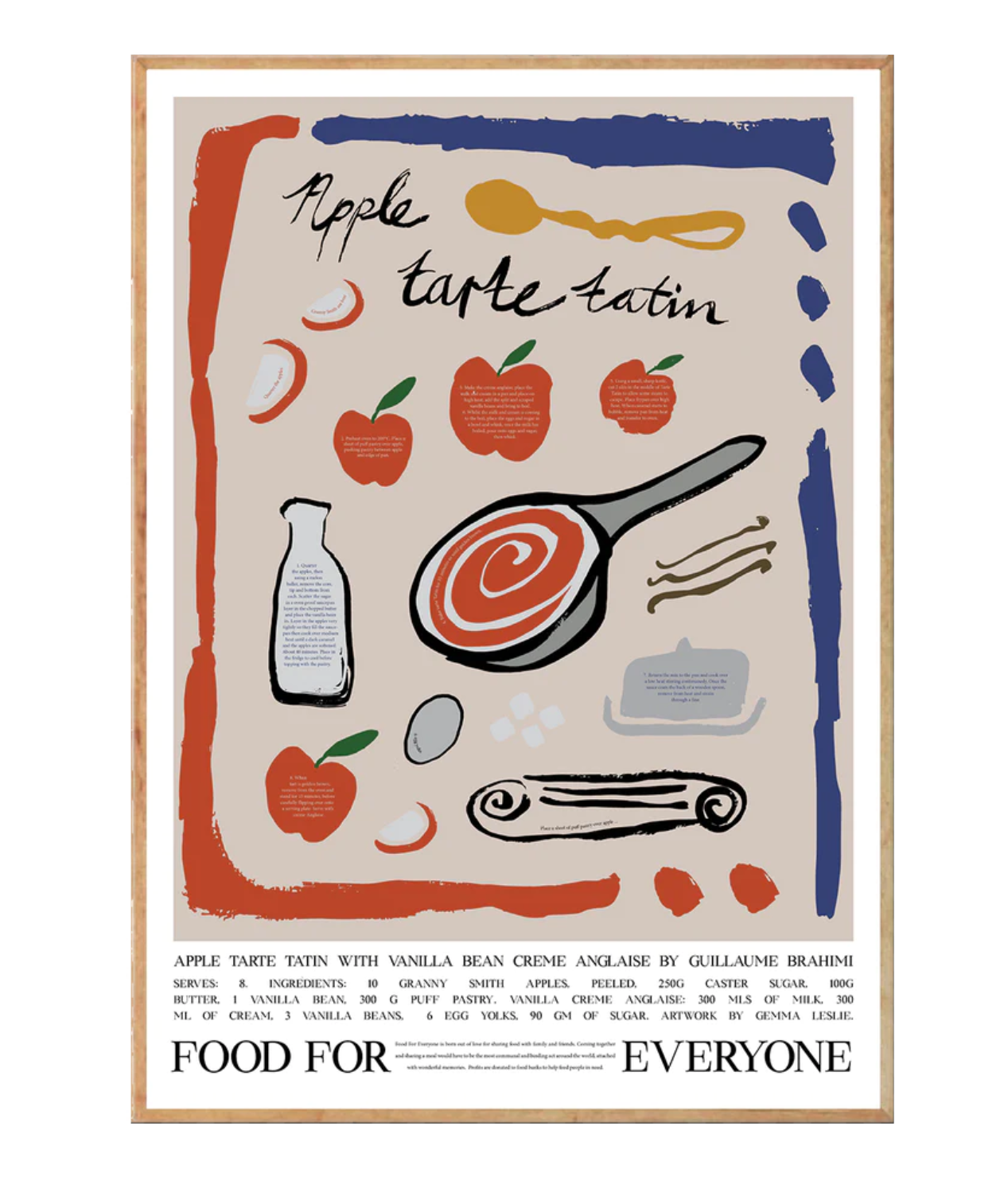Parisian native and one of Australia’s most revered chefs, Guillaume Brahimi believes that the Tarte Tatin is a quintessential part of French fare. The poster design is in keeping with classic French sensibilities with muted tones of red, blue, and white. The cursive typography mimics the ‘plat du jour’ handwriting on a bistro specials board.