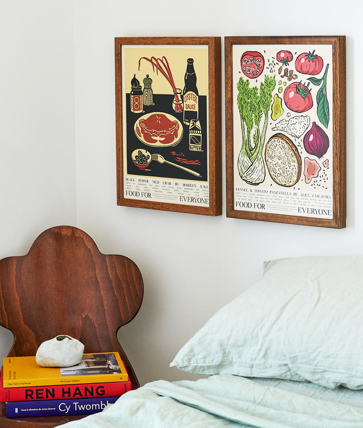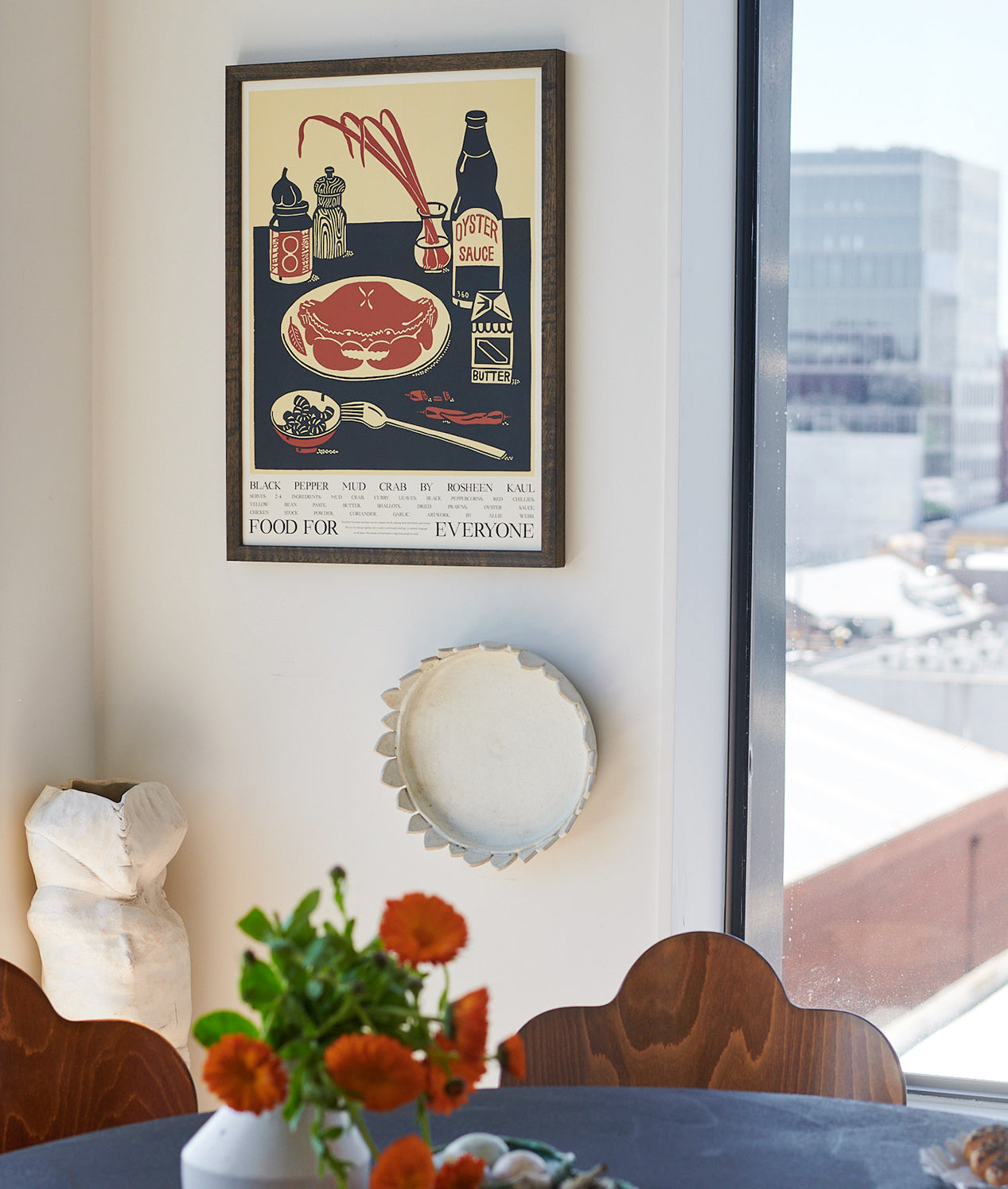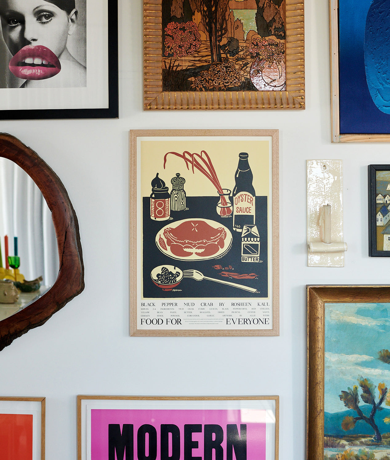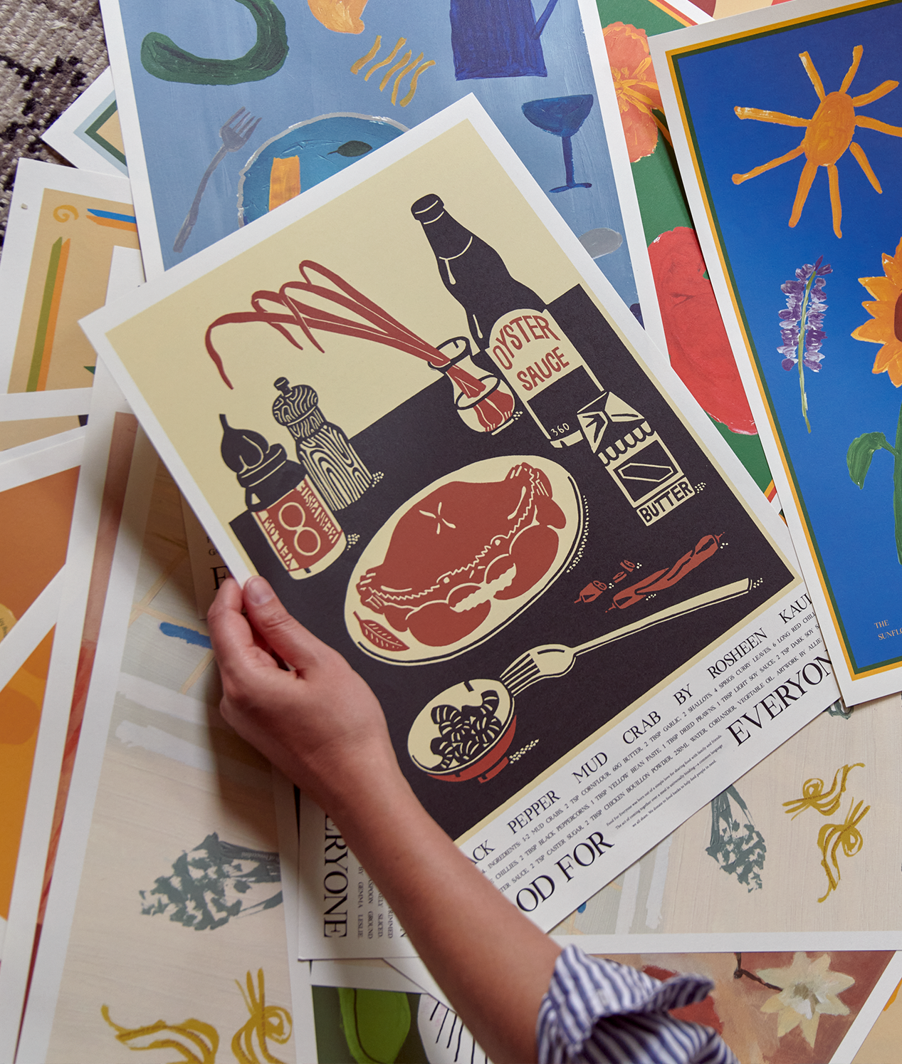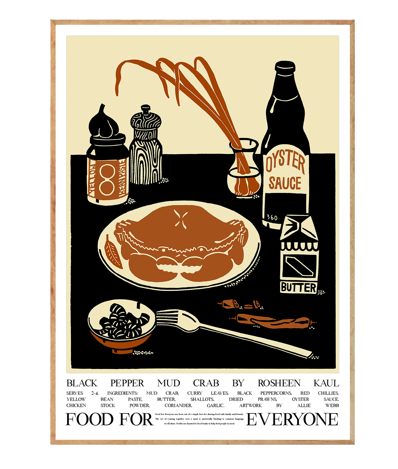 Unmistakably the work of Allie Webb, this lino-cut piece depicts Rosheen Kaul’s black pepper mud crab.