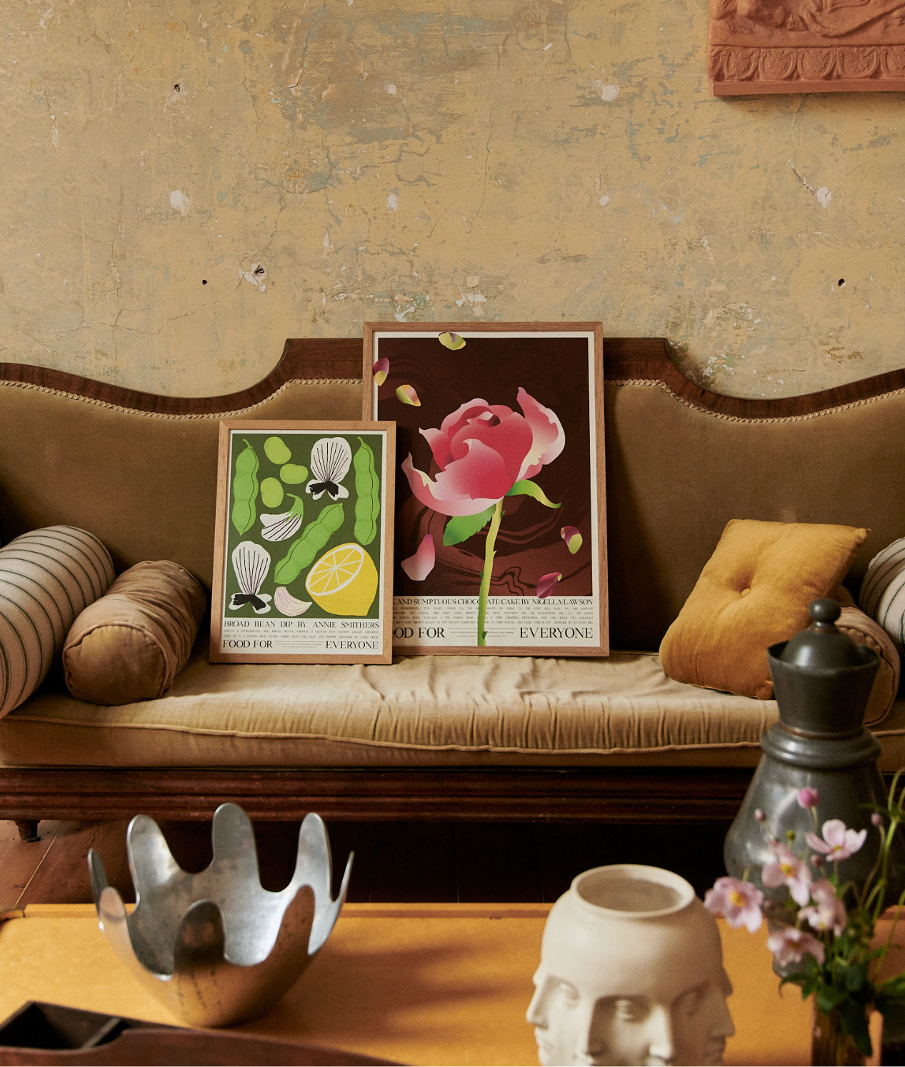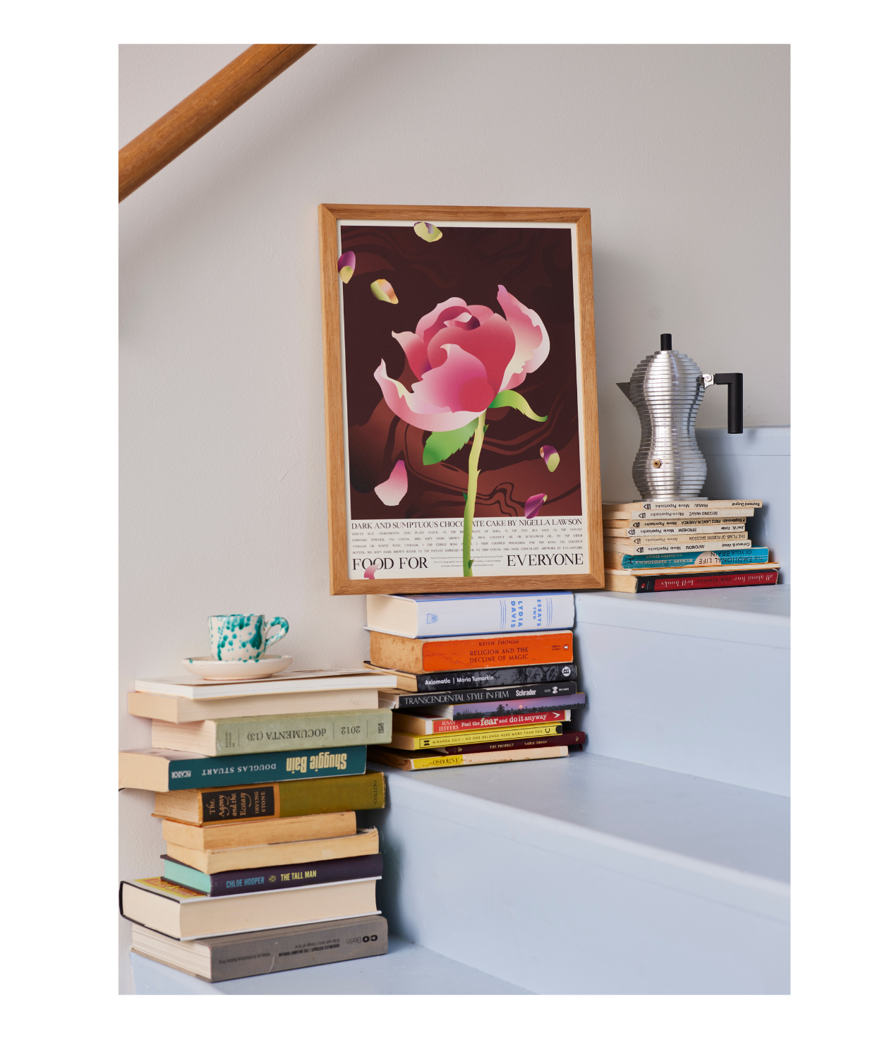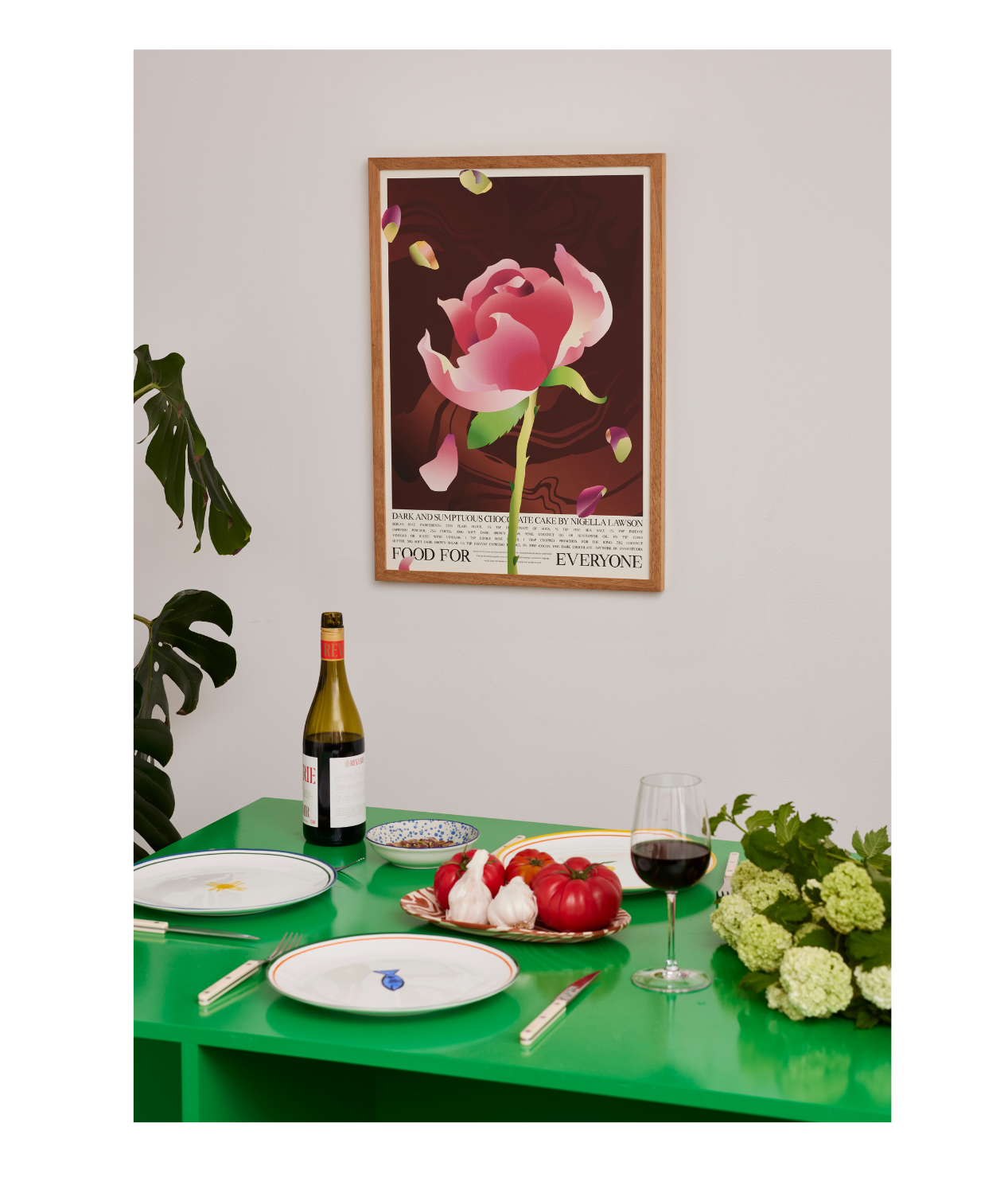 Adorned with rose petals and pistachios, this isn’t your average chocolate cake. Evi-O has run wild with the rose motif — it bursts onto centre stage, coming off the edges of the poster with pistachios tumbling down onto the swirly, devilish chocolate cake below.