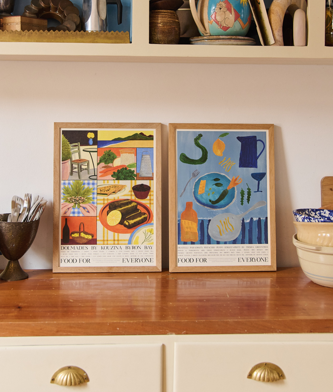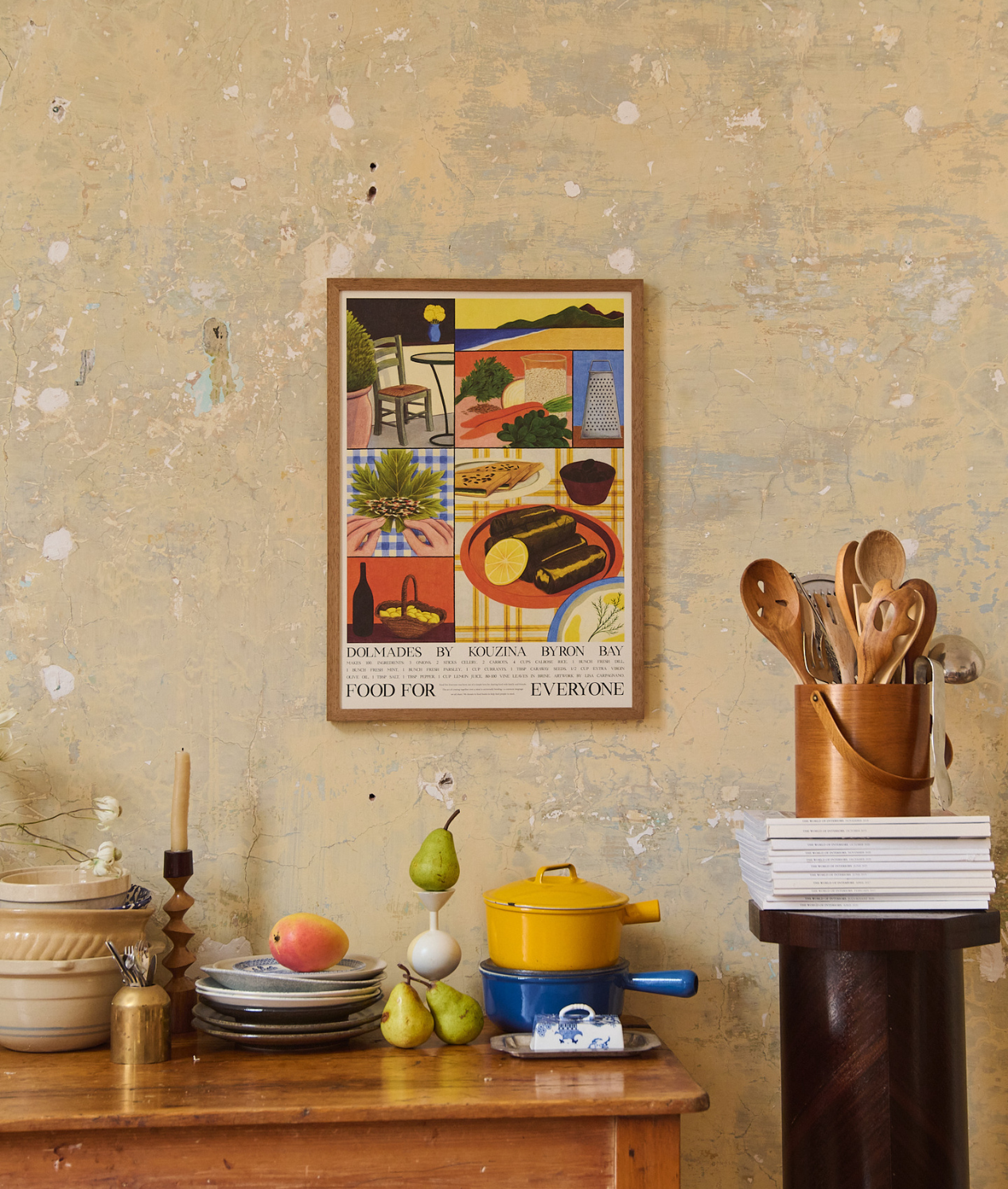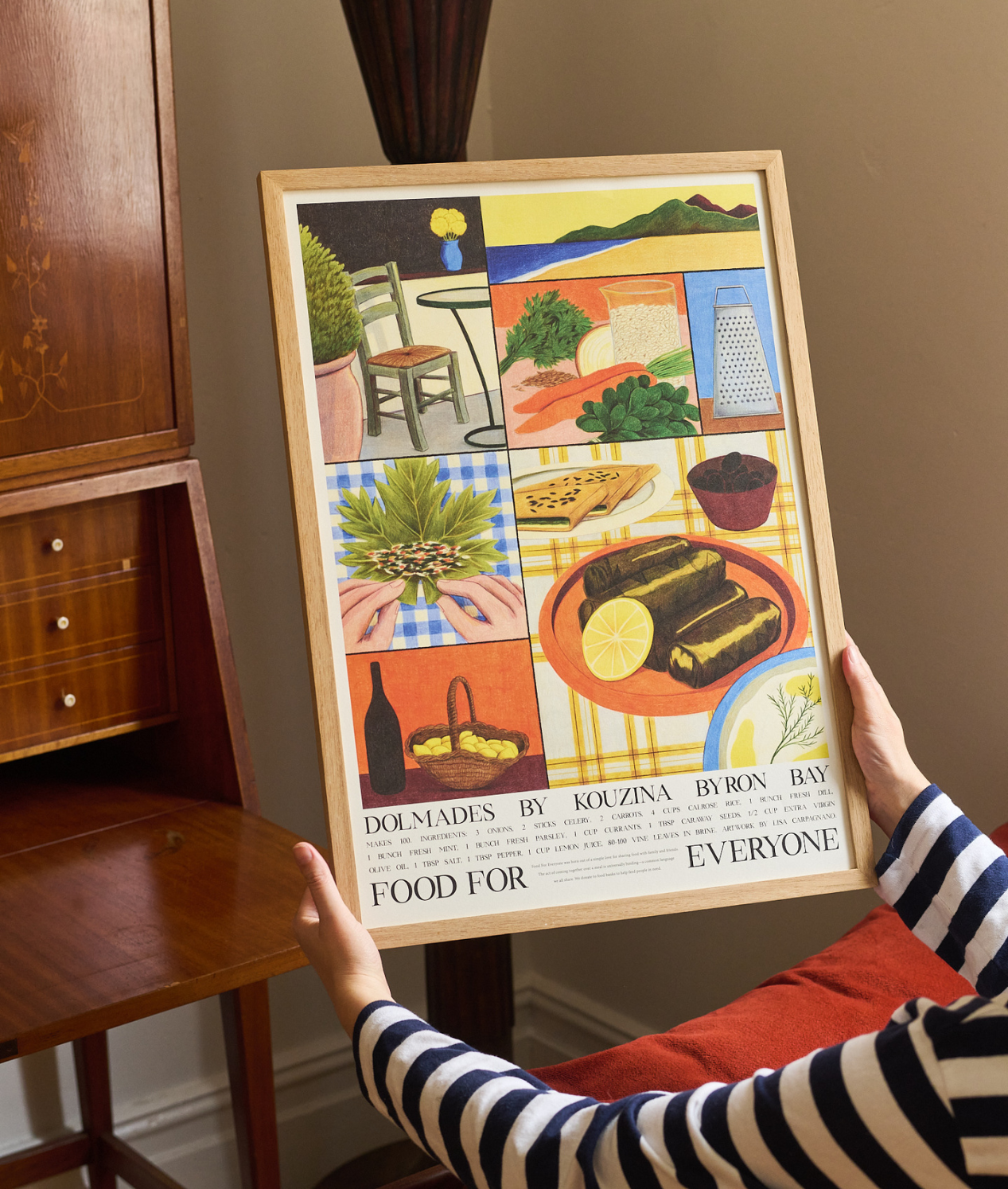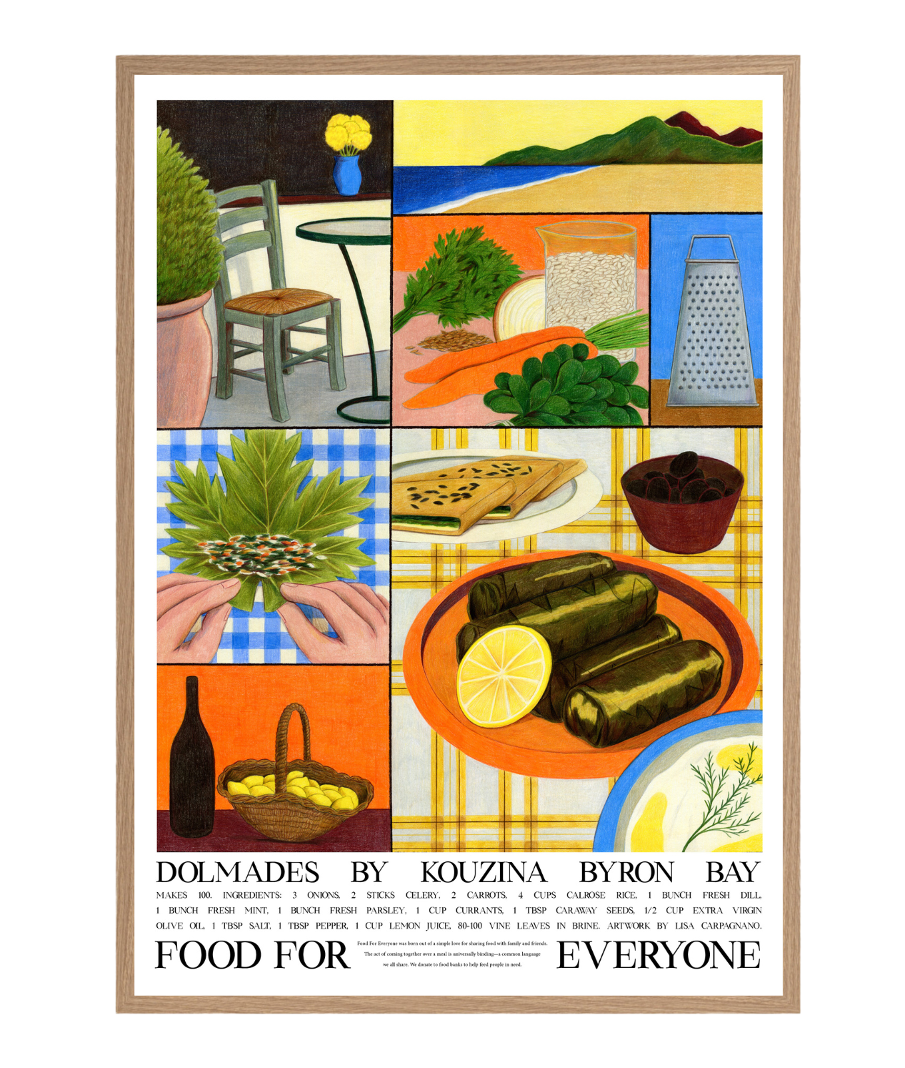 French artist Lisa Carpagnano captures Kouzina’s recipe for dolmades (a Greek specialty of stuffed vine leaves) as a cinematic journey across multiple scenes—ingredient gathering, coastal mountains, and taverna tables with chequered cloths and wooden chairs.