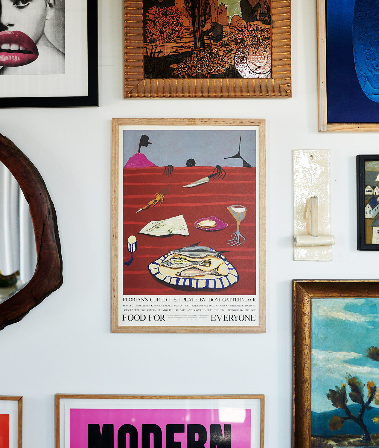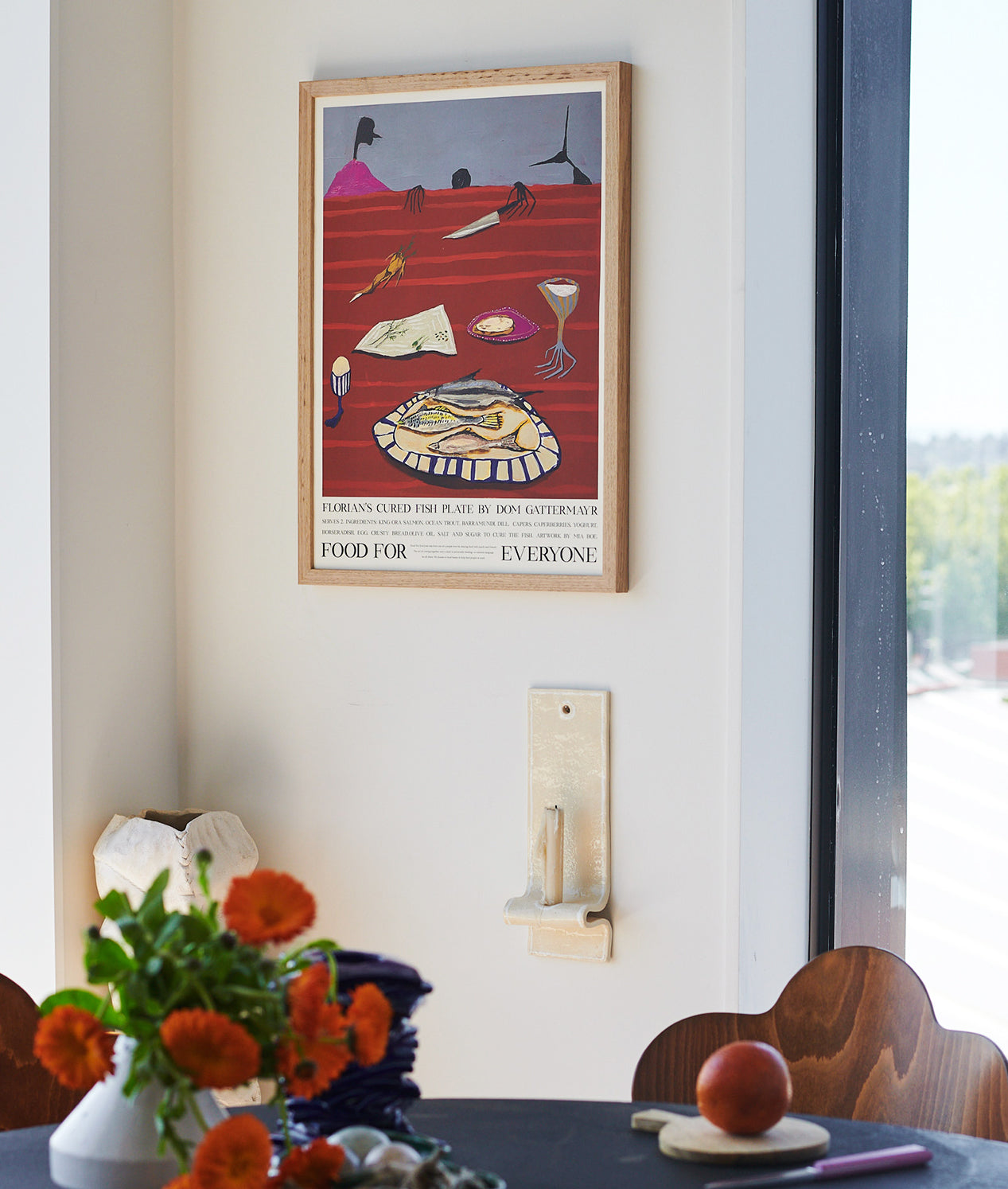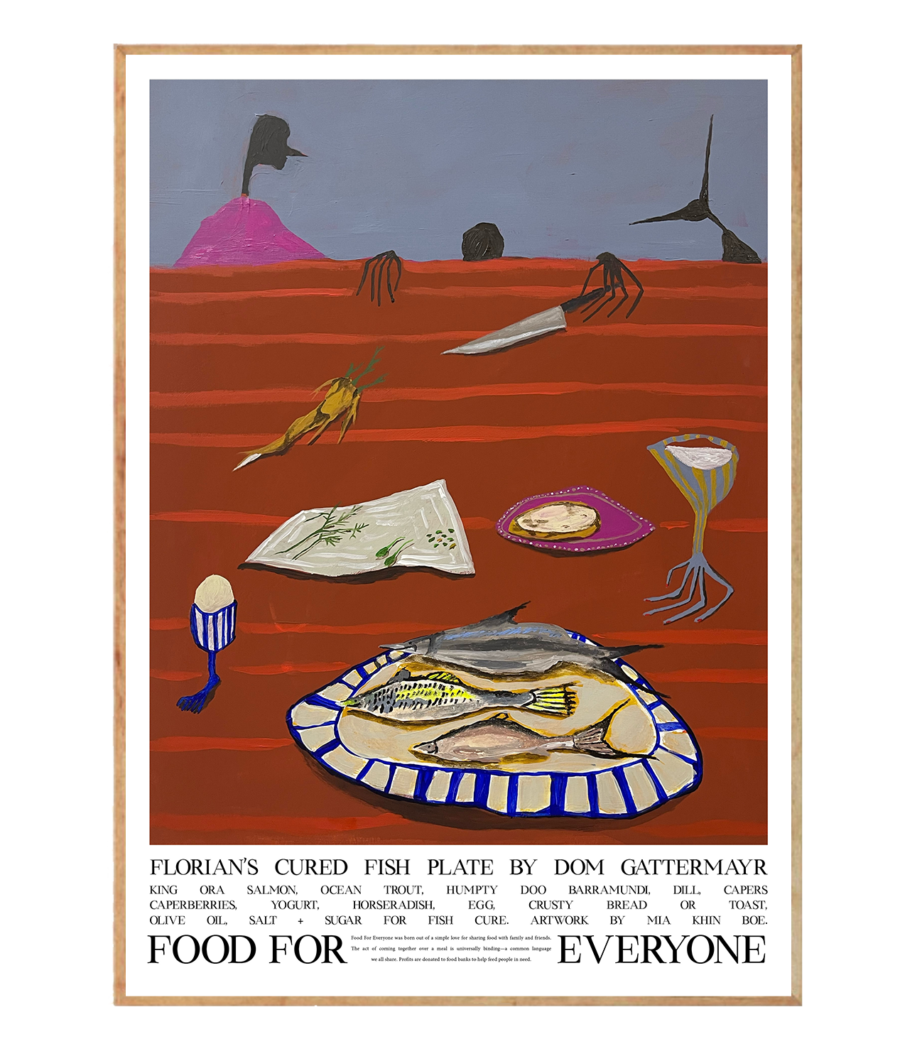A scene inspired by Salvador Dali's cookbook that artist Mia Boe discovered in a bookshop decades ago. This is Dom Gattermayr's Cured Fish Plate—an iconic dish at her eatery Florian—dreamed up by Mia.