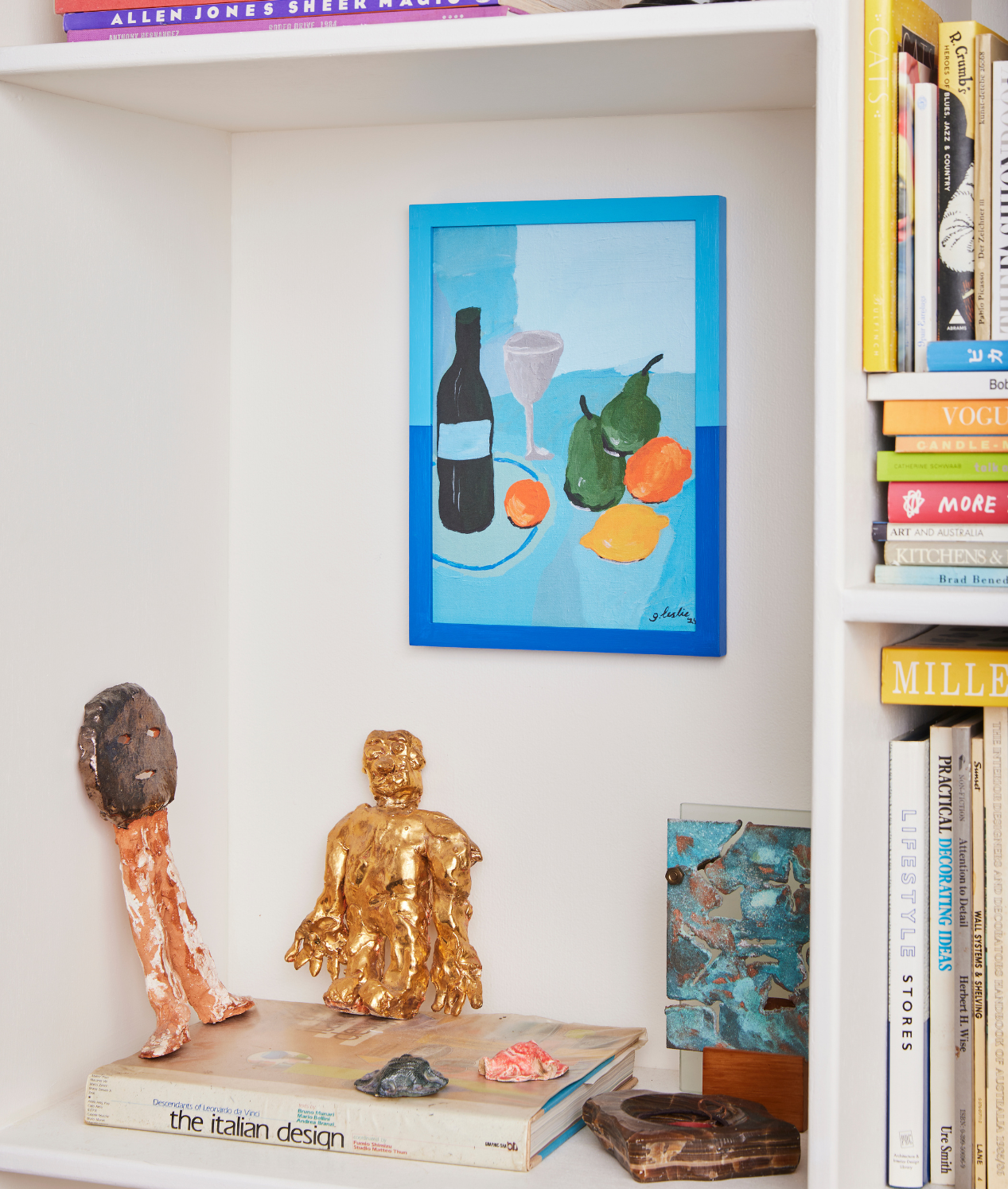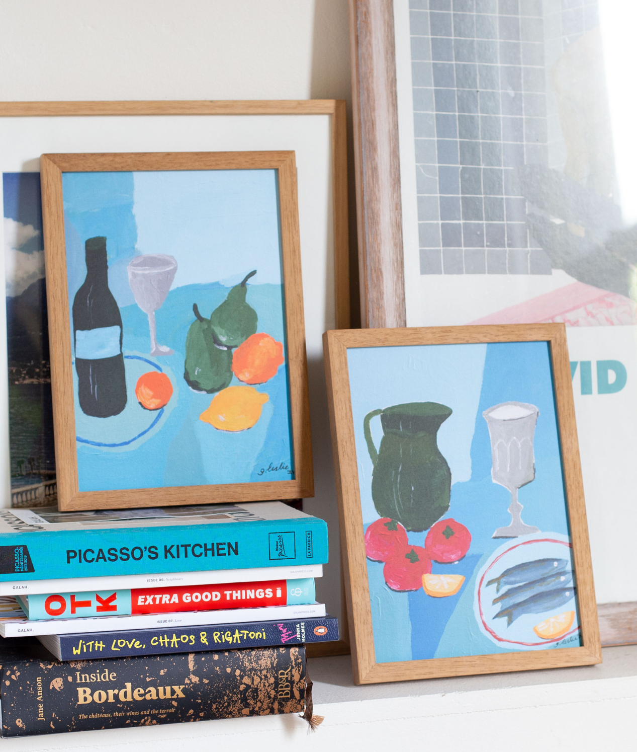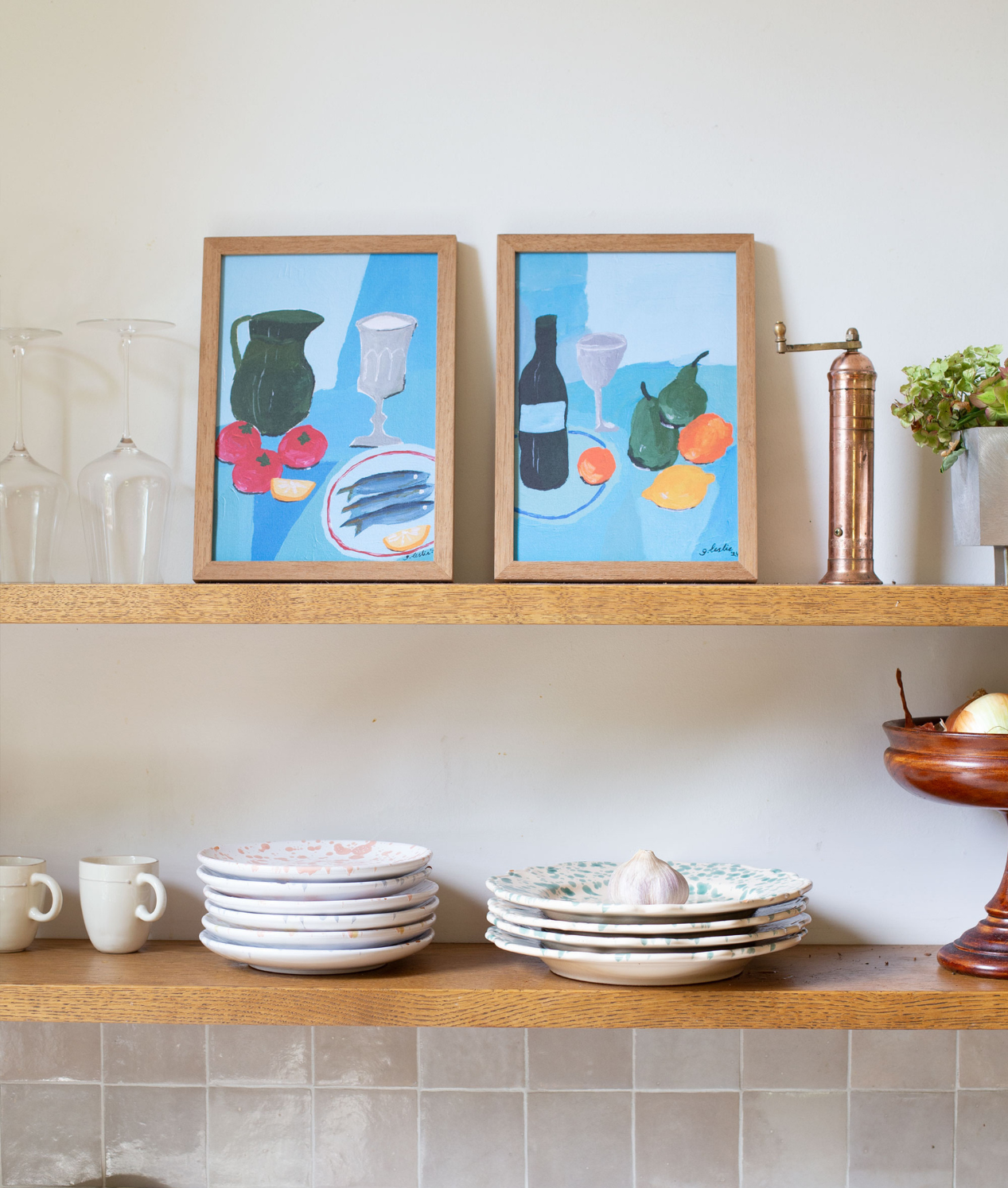 A scene rendered in shades of blue, Lunch Still Life captures the moment after coming home from the farmer's market. You unpack your produce on the kitchen table, thinking about what to piece together for lunch as your friends are arriving shortly. But before you embark on prep, you pour yourself a glass of something delicious.