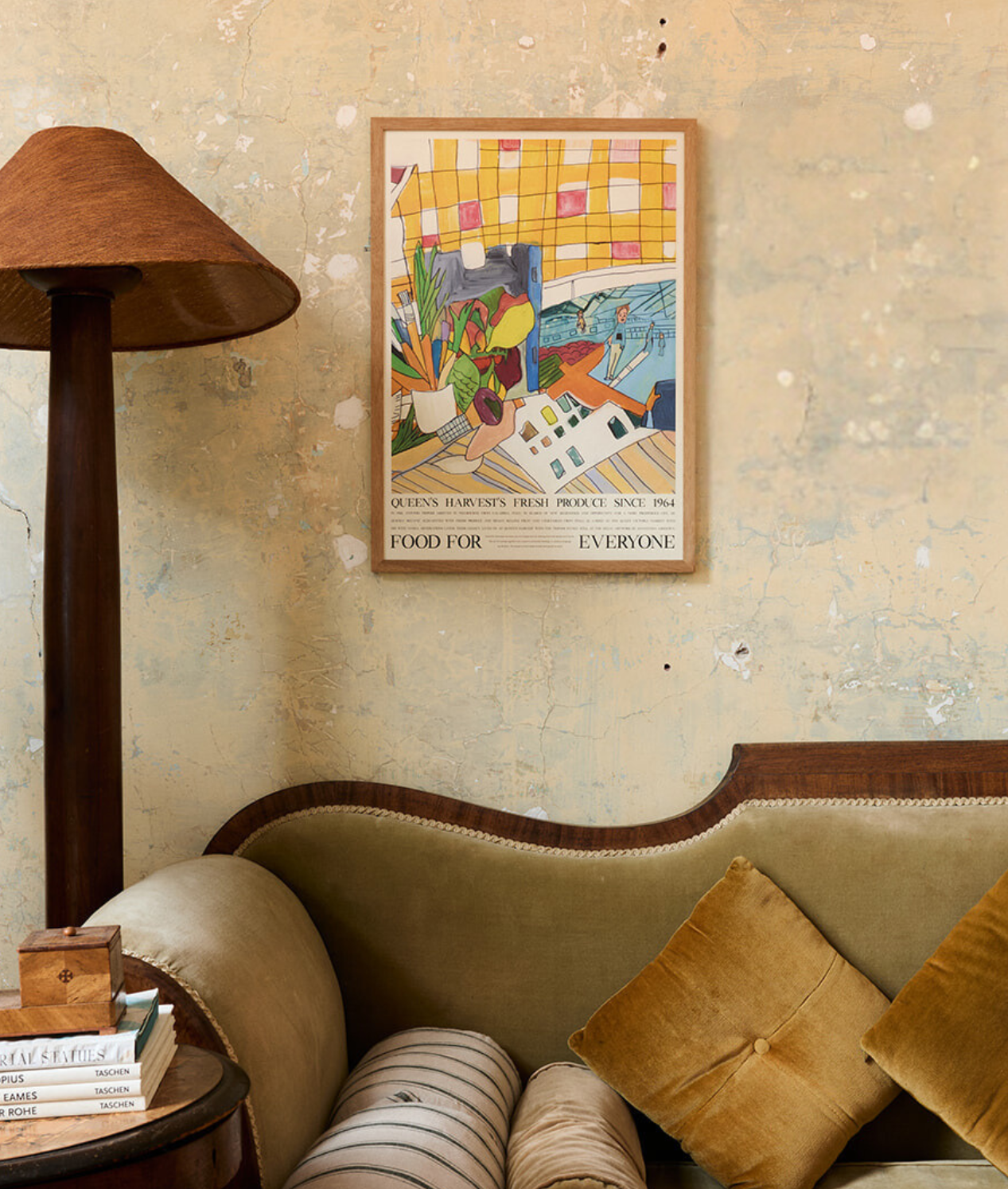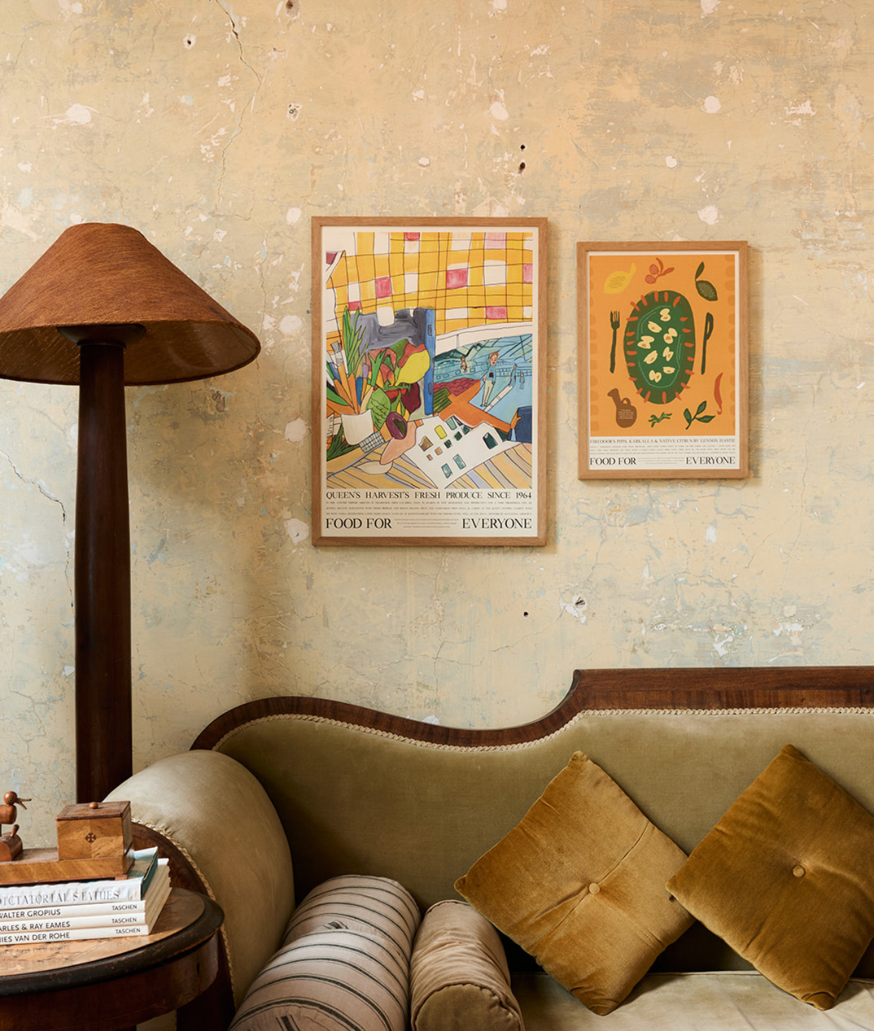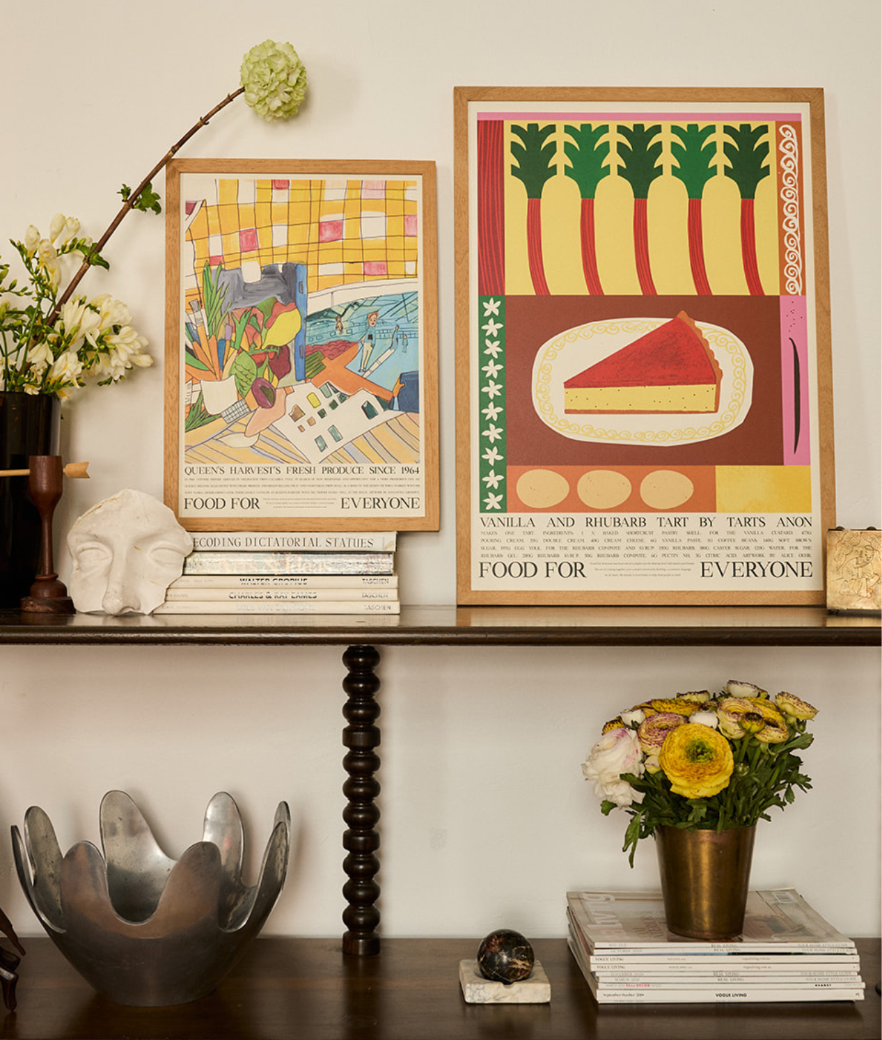 Artist Samantha Ashdown conjures the vibrant energy of the Queen Victoria Market in her still-life painting of fresh produce from specialty grocer Queen's Harvest. A market box overflows with artichokes, lemons, sweet potato onto the artist's desk; carrots nestled into her paint brushes.